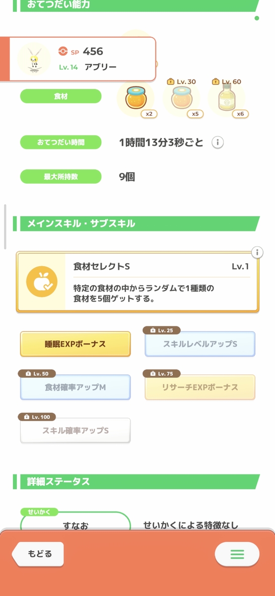 筆者が初日にゲットしたアブリー。ミツ枠は2つ、食材確率Mを50で習得、性格は無補正のすなお。う~ん妥協してもいいけれどまだまだ厳選したくなる能力だった。目指せ、ミツ3枠+食材確率M+性格れいせいの理想個体!
