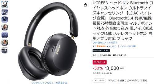 UGREENのオーバーイヤー型Bluetoothヘッドホンがタイムセール対象になっている。過去価格5,999円のところ、50%オフの3,000円で販売中。