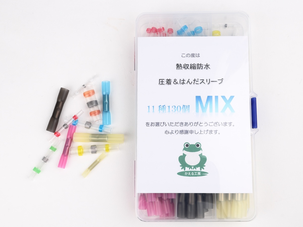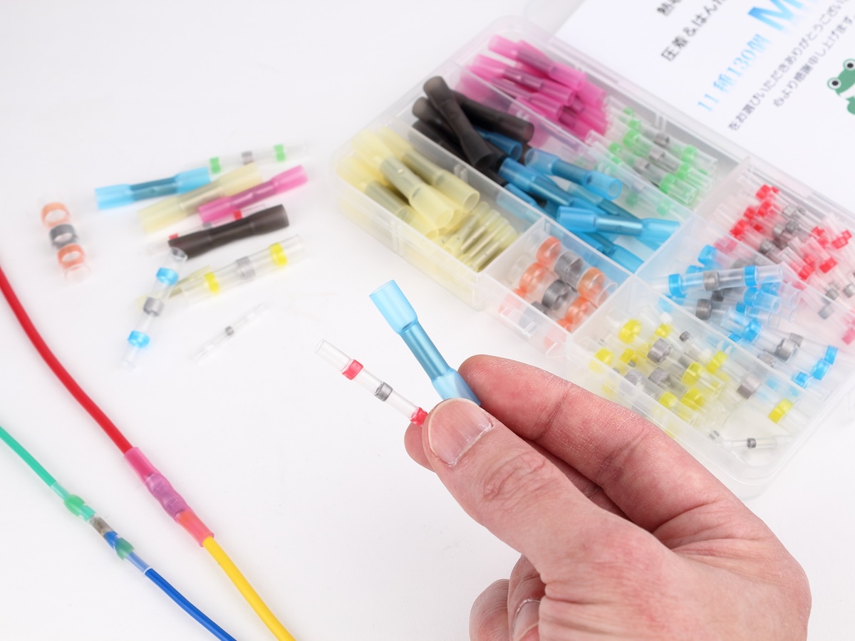 これは、はんだスリーブ6サイズ、圧着スリーブ5サイズがセットになったもの。Amazon価格は1580円。どちらも防水の熱収縮チューブがあるため、水がかかってしまうような屋外の配線にも使えます。実際に購入し、ケーブル補修を試してみました。