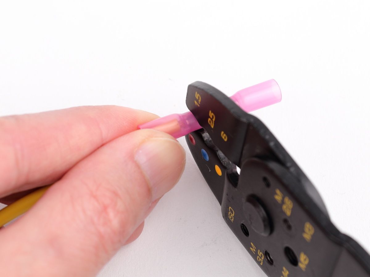 気を付けたいのは、圧着用の工具には複数種類があること。今回のように熱収縮チューブや絶縁チューブに覆われた圧着スリーブを使う場合、チューブに傷をつけないことが重要です。裸圧着端子用のように、中央を四角く凹ませて圧着するタイプの工具だと、穴があいてしまう可能性があるので避けた方がいいでしょう。楕円に潰して圧着するものが使いやすいです。