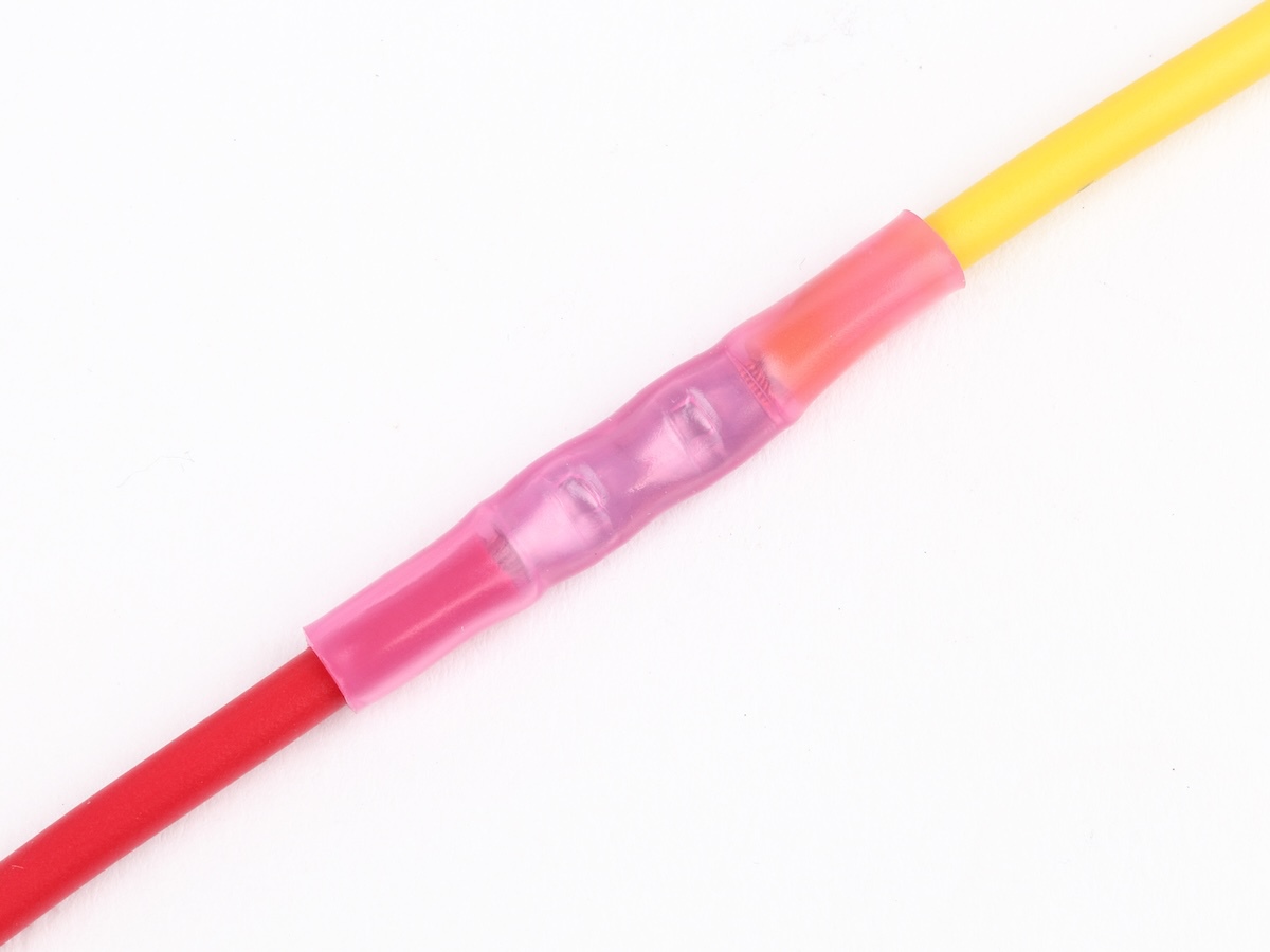 これに対し、シーンを選ばず接続できる「圧着スリーブ」は、ハンダを溶かす必要がありませんから、加熱は熱収縮チューブだけ。より簡単にキレイに仕上げやすくなっています。