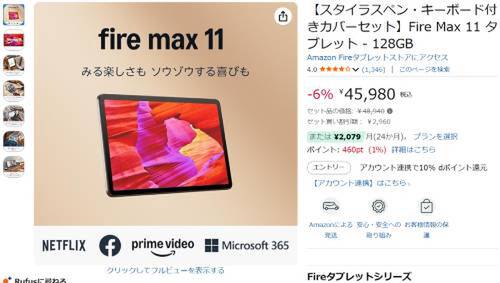 Amazonの「Fire Max 11 タブレット(128GB)」に、Made for Amazon認定スタイラスペンとAmazon純正キーボード付きカバーを組み合わせたセットモデルが販売中。セット品の価格48,940円のところ、6%オフの45,980円で購入できる。