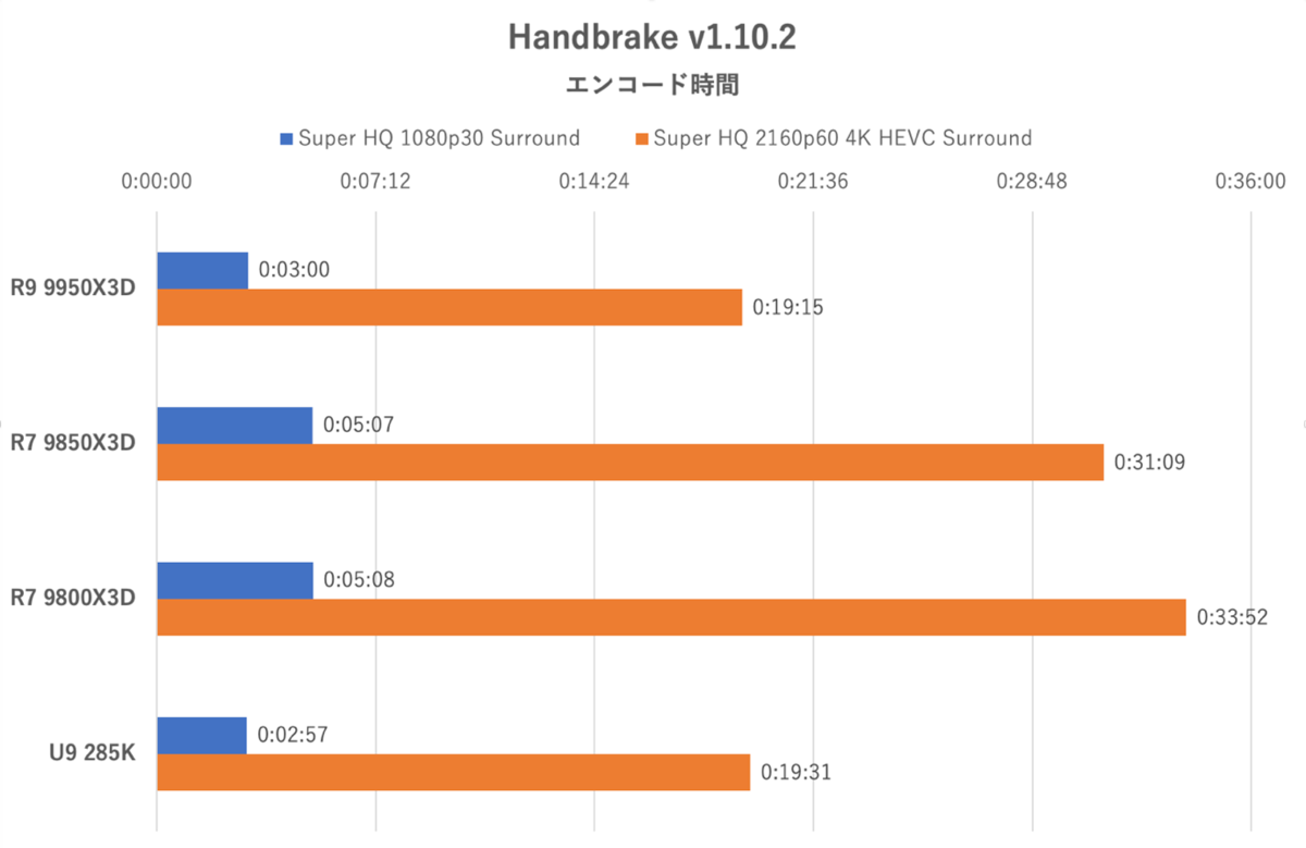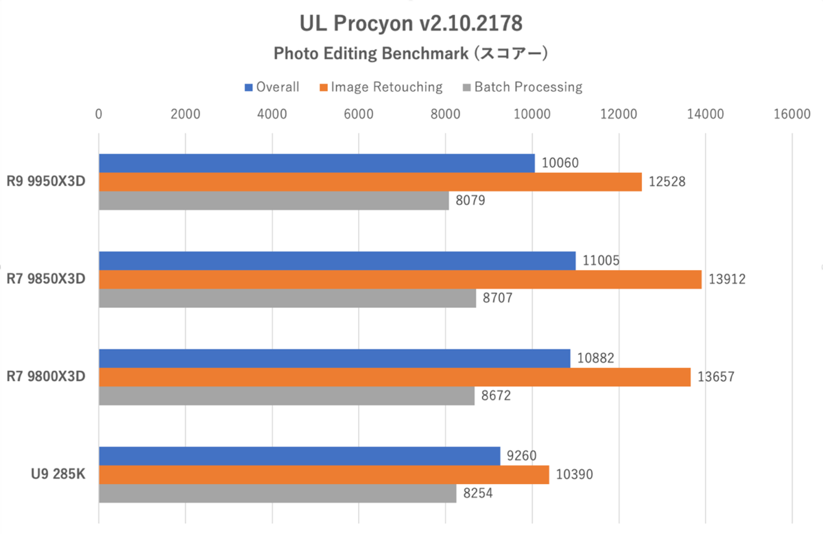「Photoshop」と「Lightroom Classic」を動かし、一連の処理(ワークロード)にかかった処理時間からスコアーを算出するテスト。コア数の多いRyzen 9 9950X3DやCore Ultra 9 285KよりもRyzen 7 9850X3Dのスコアーが全般的に高い点に注目したい。シングルスレッド寄りの処理が多いと、ベースクロックが高くコア数も少ないRyzen 7 9850X3Dが有利になる