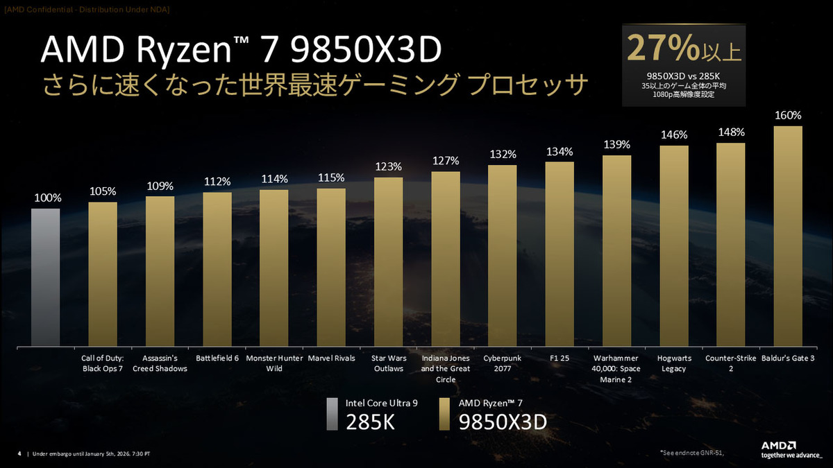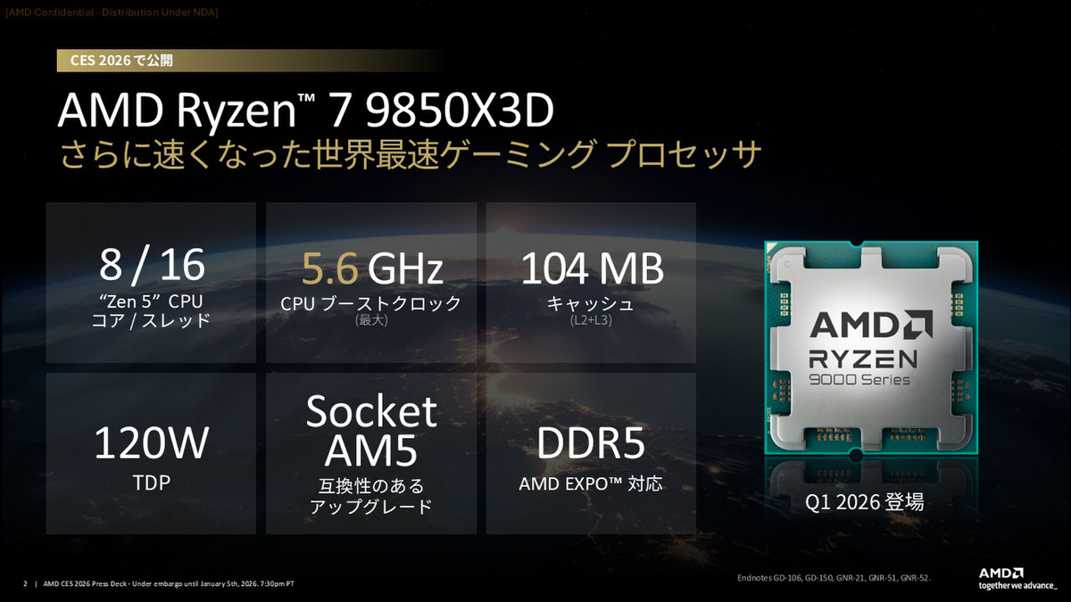 2026年1月下旬、AMDが「AMD Ryzen™ 7 9850X3D」の国内販売を開始した。国内価格は9万4800円だ。製品名の末尾に“X3D”が付くゲームに強いCPUということで、多くのゲーマーが楽しみにしていたはずだ。Zen 5アーキテクチャを採用した8コア/16スレッドのCPUとなっており、64MBの第2世代「AMD 3D V-Cache™」を組み合わせることで、合計96MBもの大容量3次(L3)キャッシュを実現している。第2世代「AMD 3D V-Cache」はゲームによっては高いフレームレートを期待できるため、まさにゲーマーに最適なCPUとなっている。