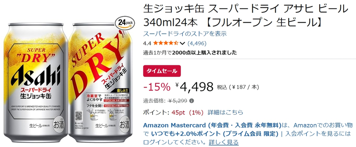 現在、Amazonタイムセールの対象となっており、15%オフの4,498円で販売されています。過去価格は5,299円です。1本あたりの価格は約187円です。