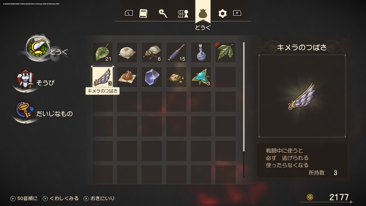 それが本作では、「戦闘中に使うと必ず逃げられる」という効果に変更。さすがにボス戦などでは使えないと思うが、「しかしまわりこまれてしまった!」で危うく全滅の憂き目にあうことを考えれば重要なアイテムと言えるだろう。