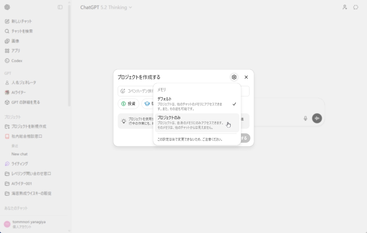 プライベートでも使っているChatGPTで、万が一にもプロジェクトの入出力に他のやり取りの影響が出ては困る、という人は「プロジェクトのみ」にしておくと安心だ。通常は「デフォルト」のままでいいだろう。