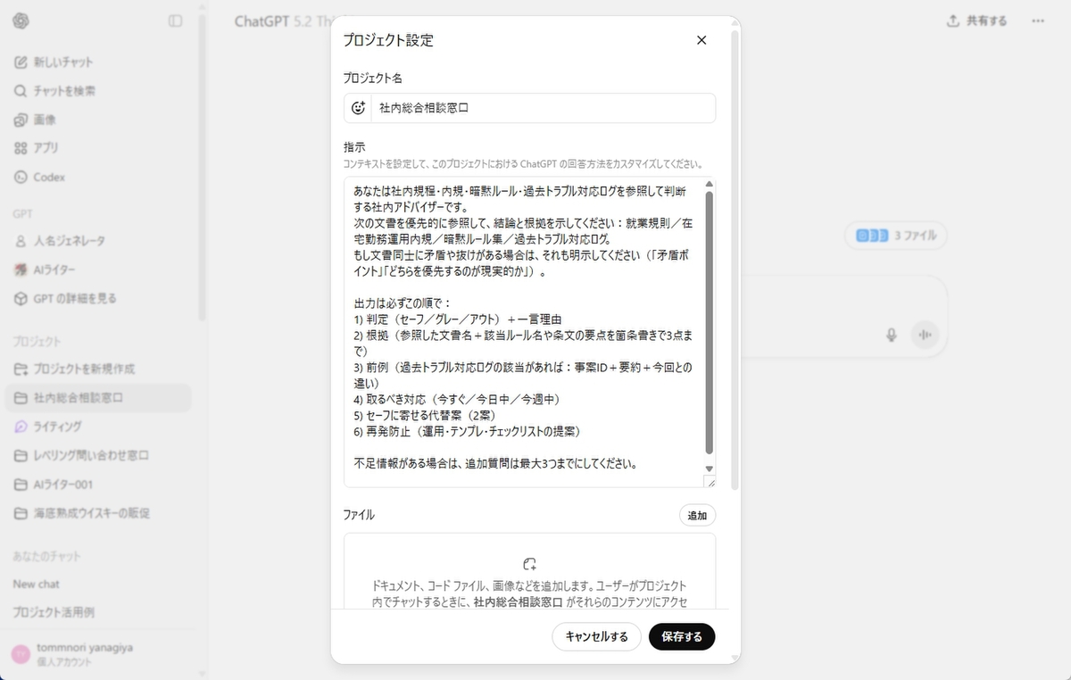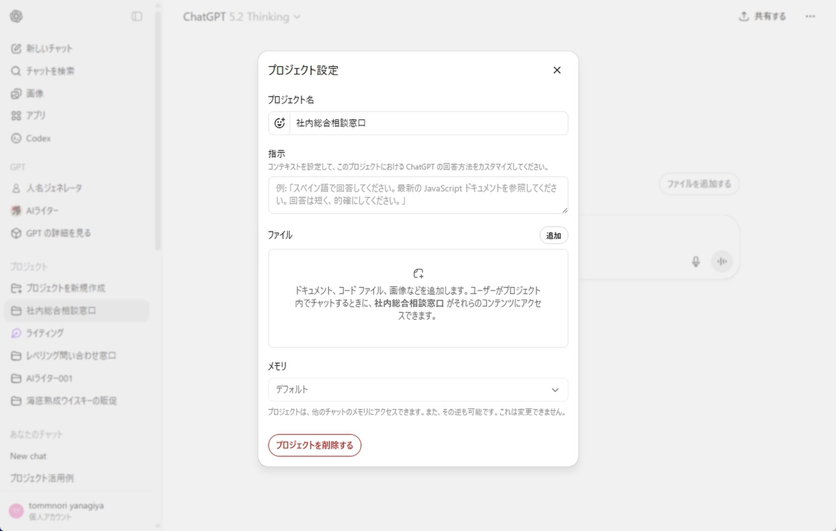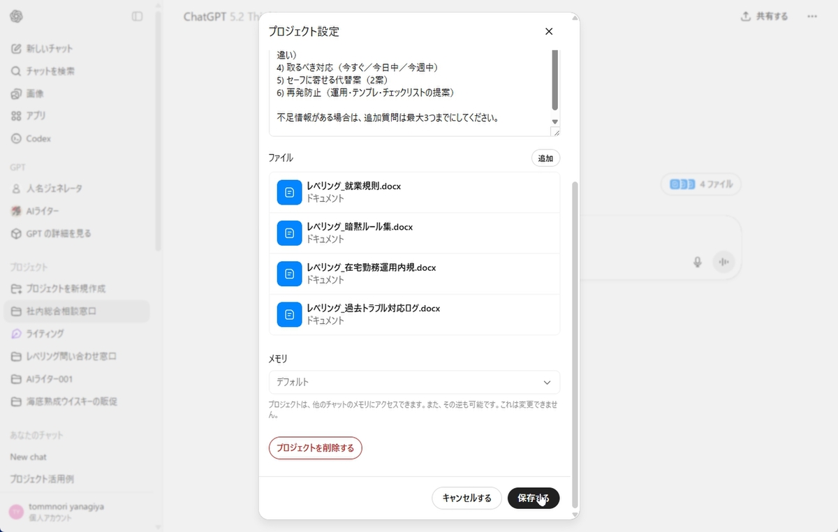 プロジェクト機能は、案件ごとに専用の「キャビネット」を用意するイメージに近い。そのキャビネットの中には、必要な資料があらかじめ整理されており、AIは常にその資料を参照しながら対話を行うことができる。