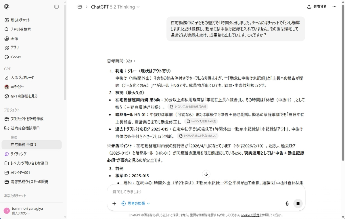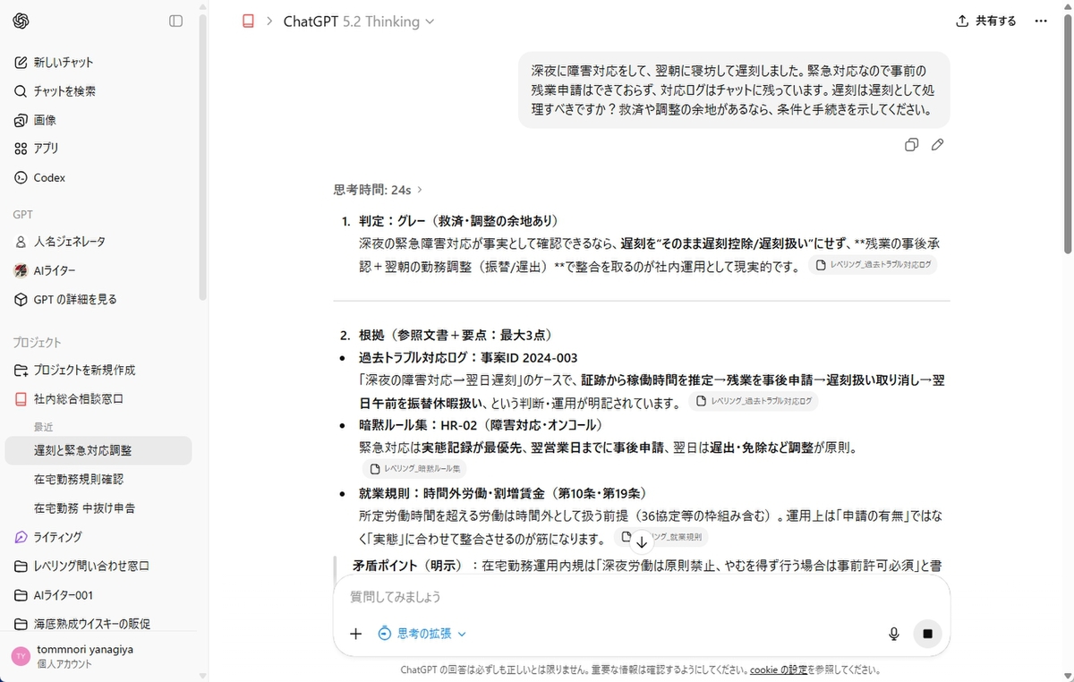 設定が終わったら、プロジェクトに質問してみよう。まずは、就業中に1時間外出した件が大丈夫かどうか心配になった人が相談してみた、と想定。ChatGPTは、勝手に判断せず、登録された資料を検索し始める。