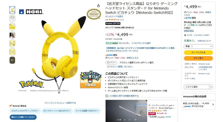 Amazon.co.jpにて、ホリの「【任天堂ライセンス商品】なりきり ゲーミングヘッドセット スタンダード for Nintendo Switch ピカチュウ【Nintendo Switch対応】」が販売中だ。参考価格は5035円だが、執筆時点では11%オフの4499円で購入できる。