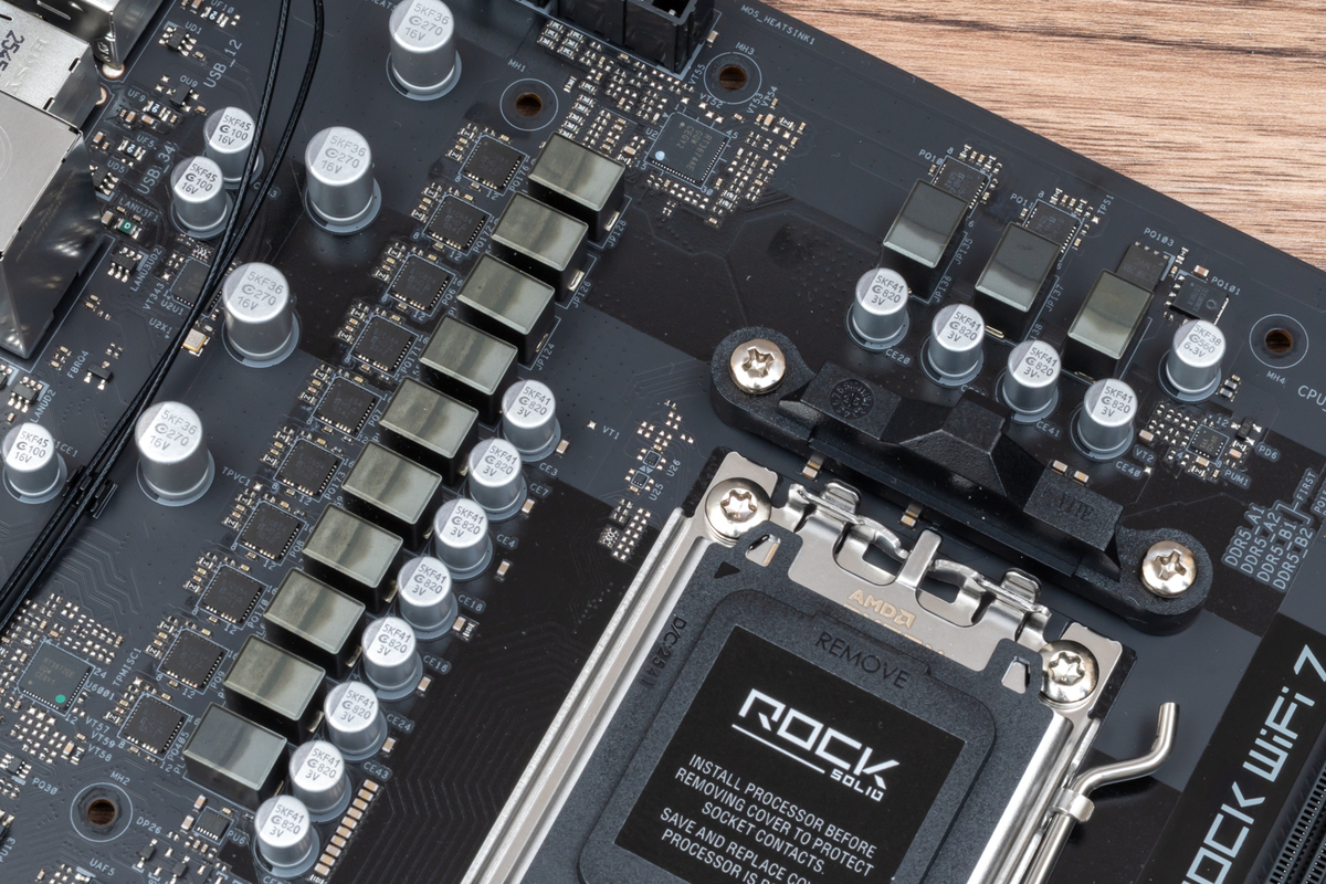 32スレッドCPUとの組み合わせにも不安を感じない11フェーズの電源回路に加え、CPU 12Vコネクターは8ピン×2基仕様となっている。長く使えるSocket AM5プラットフォームだけに、ここはうれしいポイント。低コストゲーミングPCに人気のある6コア/12スレッドCPUのRyzen 5 7500Fや、性能と価格のバランスが良い8コア/16スレッドのRyzen 7 9700Xなどから、将来Ryzen 7 9800X3DやRyzen 7 9850X3Dに、グレードアップする際も安心だ。