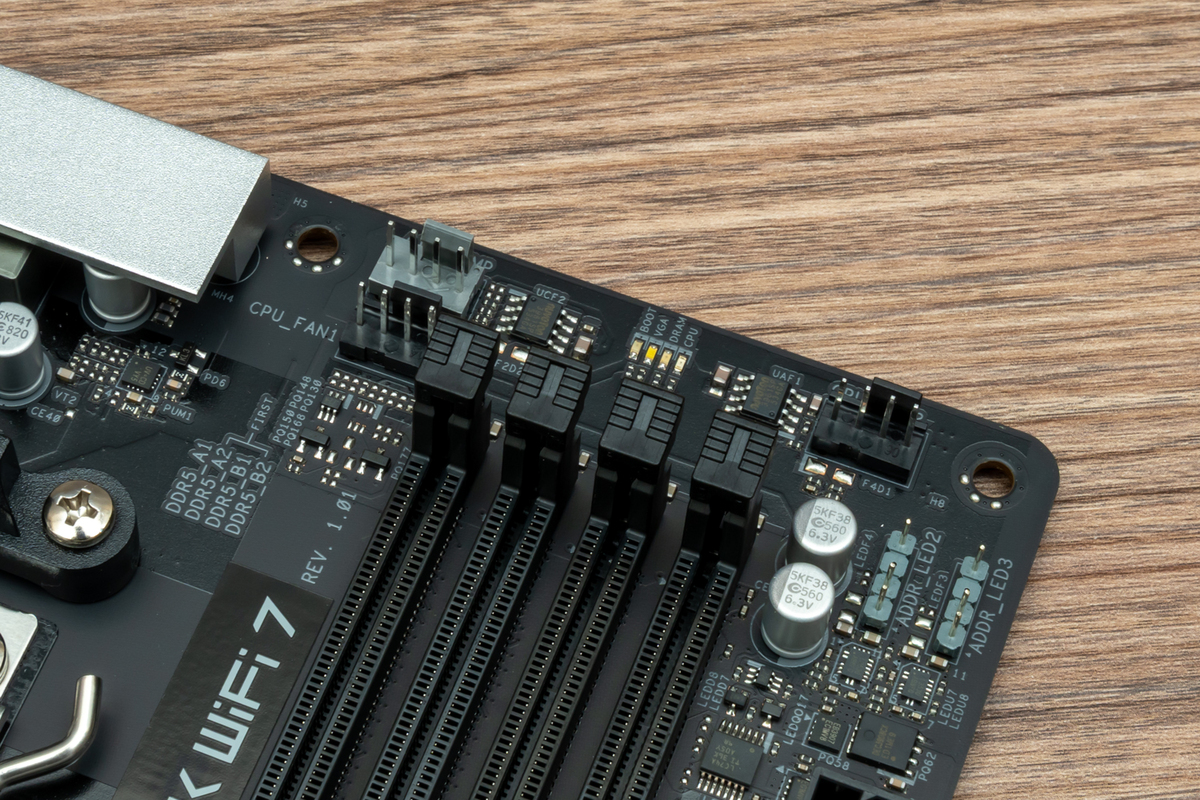 メモリースロット上部には、CPUクーラーや水冷クーラーのポンプ向け3ピンPWMコネクターと、アドレサブルRGB LEDピンが並んでいる。CPUクーラーやラジエーターファン、LEDギミックを接続するにはちょうどいい位置で、配線しやすい。