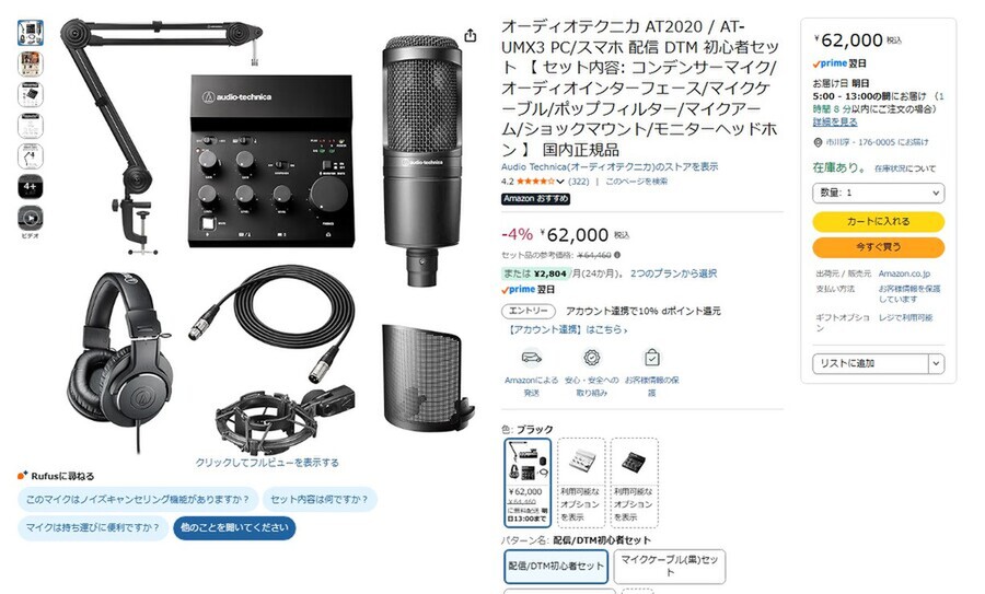 Amazon.co.jpにて、コンデンサーマイクやマイクアーム、ヘッドセットなどがセットになった「オーディオテクニカ AT2020 / AT-UMX3 PC/スマホ 配信 DTM 初心者セット」が販売中だ。セット品の参考価格は6万4460円だが、執筆時点では4%オフの6万2000円で購入できる(2月13日時点)。
