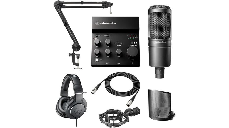 本製品は、配信やDTMに必要なデバイスがそろった初心者セット。セット内容はコンデンサーマイク「AT2020」、オーディオインターフェース「AT-UMX3」、マイクケーブル「BX3/3.0 BK」、ポップフィルター「AT8175」、マイクアーム「AT8700J」、ショックマウント「AT8458a」、モニターヘッドフォン「ATH-M20x」と、すべてオーディオテクニカの純正品だ。