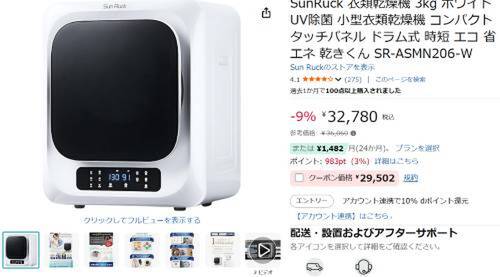 SunRuckの小型衣類乾燥機「SR-ASMN206-W」が割引対象になっている。参考価格36,060円のところ、9%オフの32,780円で販売中。