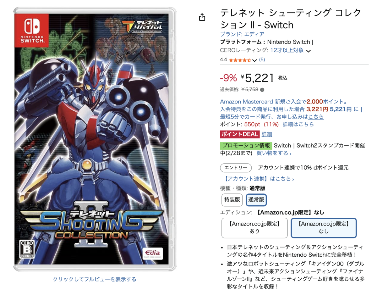 そんな私が推すのが、「テレネット シューティング コレクション II - Switch」です。パッケージ版の過去価格は5,758円ですが、今なら9%オフの5,221円でAmazonから購入できます。