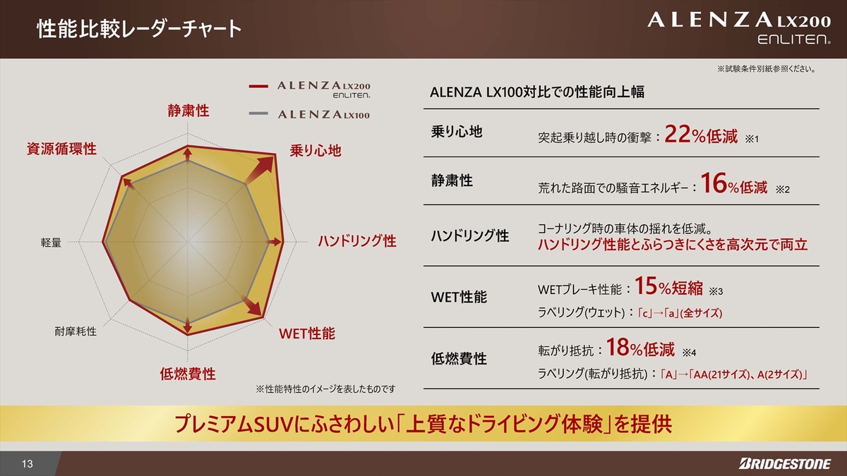 「アレンザ LX200」と先代の「LX100」は、ブリヂストンの「アレンザ」シリーズの中でも、特にコンフォート性能(快適性)を重視した製品となります。プレミアムSUV向けの中でも、快適性や静粛性に特にこだわった製品です。