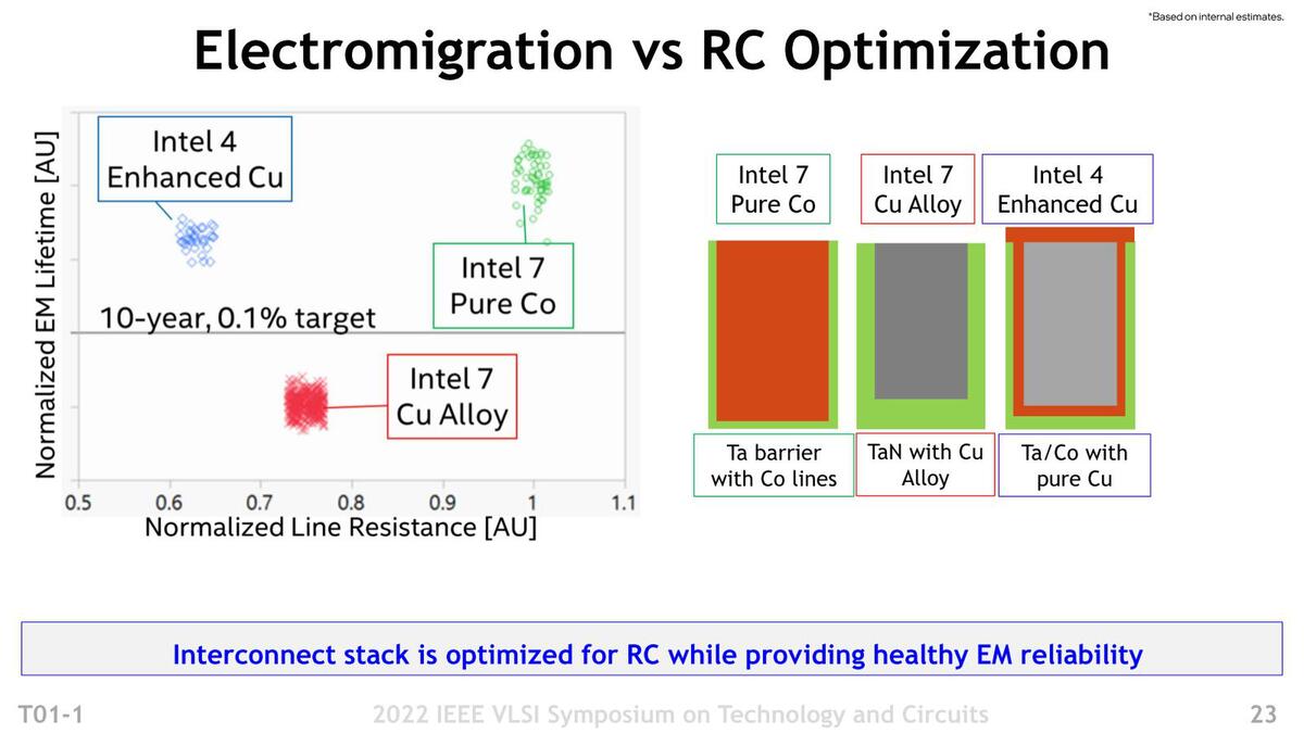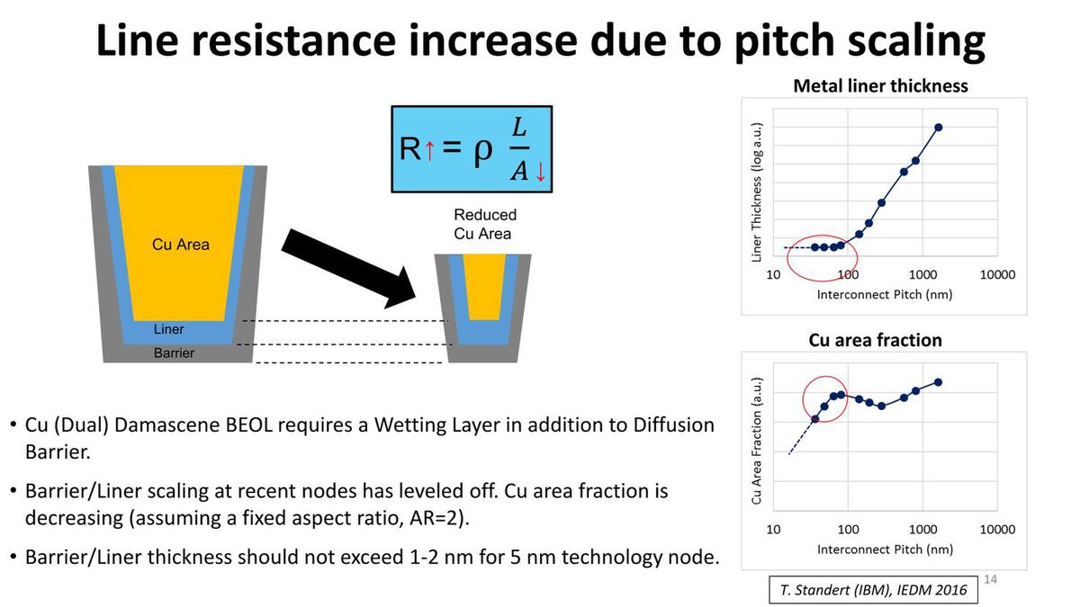 ポストCu世代に入る前に、Cu世代の問題について簡単にまとめておく。連載809回で、インテルがRu(ルテニウム)を配線に利用する話を書いたが、まずこの手前の話。配線ピッチを詰めていくと、配線層に占める銅の断面積がどんどん減り、抵抗が増えてエレクトロマイグレーション(材質に欠損が生じる現象)も起きやすくなる。