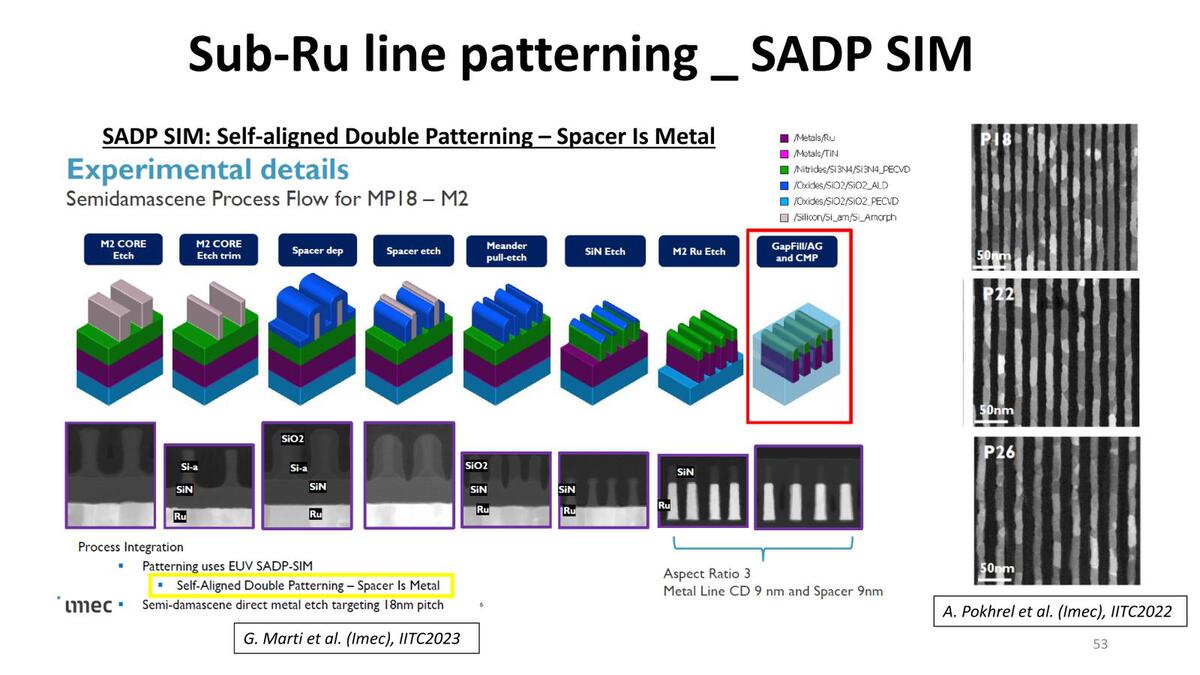 高さを稼ごうとすると、比較的簡単なのはSADPを使って製造することになる。もちろんRu配線が利用されるのはトランジスタ層に比較的近いM0~M3あたりまでなので、SADPが利用されるのはごく普通である。