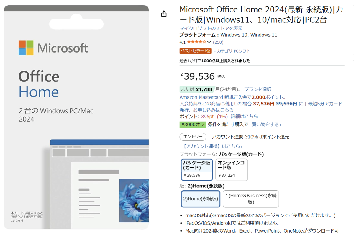 Microsoft Office Home 2024(最新 永続版)カード版が、Amazon.co.jpで販売中です。価格は39,536円で、値引きセールもないため少々高値ですが、サブスクではなく、パッケージ版が欲しい方は要チェックです!