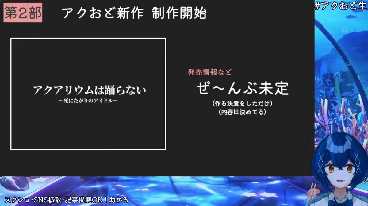 インディーゲーム「アクアリウムは踊らない」の2周年記念配信にて、作者・橙々氏は新作ゲーム「アクアリウムは踊らない~死にたがりのアイドル~」の制作決定を発表した。