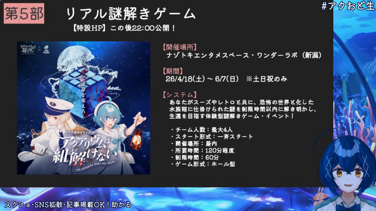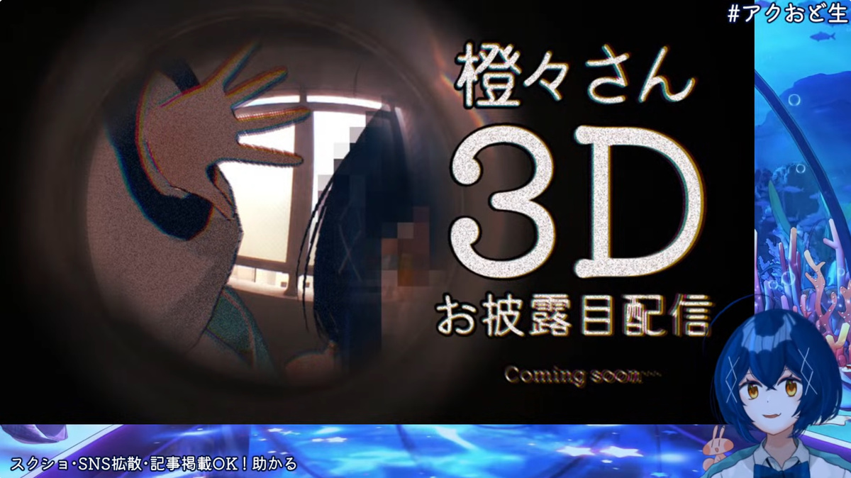 そのほか、まだ何も作っていない新作のグッズを「この配信の後から」販売したり、以前からやりたかったと語るリアル謎解きゲーム「アクアリウムは紐解けない」の開催決定を発表したり、橙々氏の3Dお披露目配信を告知したりと、2周年に相応しい大ボリュームの発表となった。