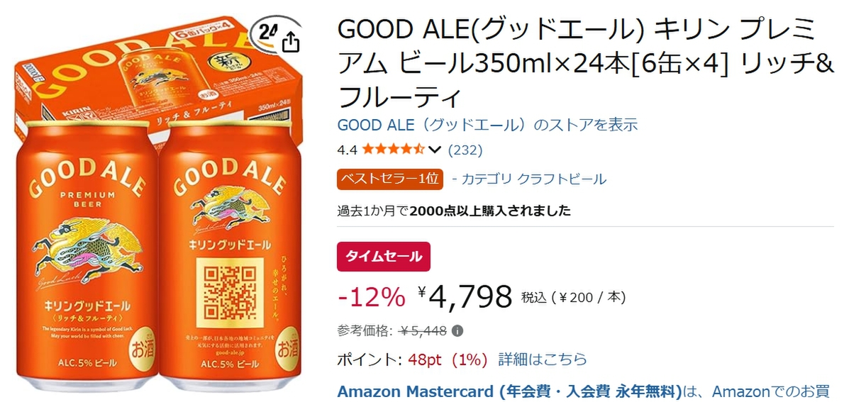 Amazonのクラフトビールカテゴリで支持を集めている「GOOD ALE(グッドエール) リッチ&フルーティ 350ml×24本」が、現在開催中のAmazonタイムセールの対象となっています。
