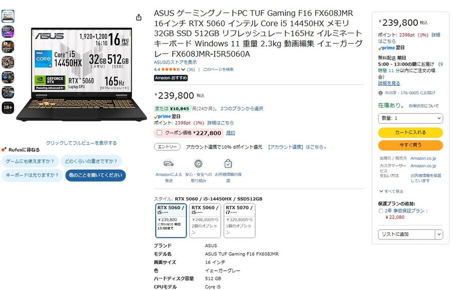 RTX 5060搭載のASUS製16型ゲーミングノート、165Hzや32GBメモリーも含めて23万9800円はお買い得では?