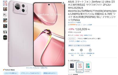 ASUSの「Zenfone 12 Ultra」が、Amazonで割引対象になっている。参考価格136,182円のところ、19%オフの110,939円で販売中。