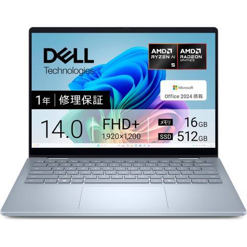 14型の2-in-1は各社から出ているが、価格を抑えるためにメモリやストレージ、付属品を抑えたモデルも少なくない。この「Dell 14 Plus 2-in-1 DB04255」は、Ryzen AI 5 340(NPU 50TOPS)に16GBメモリ、512GB SSD、Office 2024、さらに翌営業日対応オンサイト修理までが揃う。