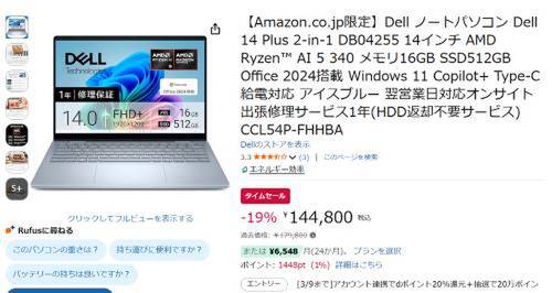 Dellの14型2-in-1「Dell 14 Plus 2-in-1 DB04255」がAmazonでタイムセール対象となっている。過去価格179,800円のところ、19%オフの144,800円で販売中。
