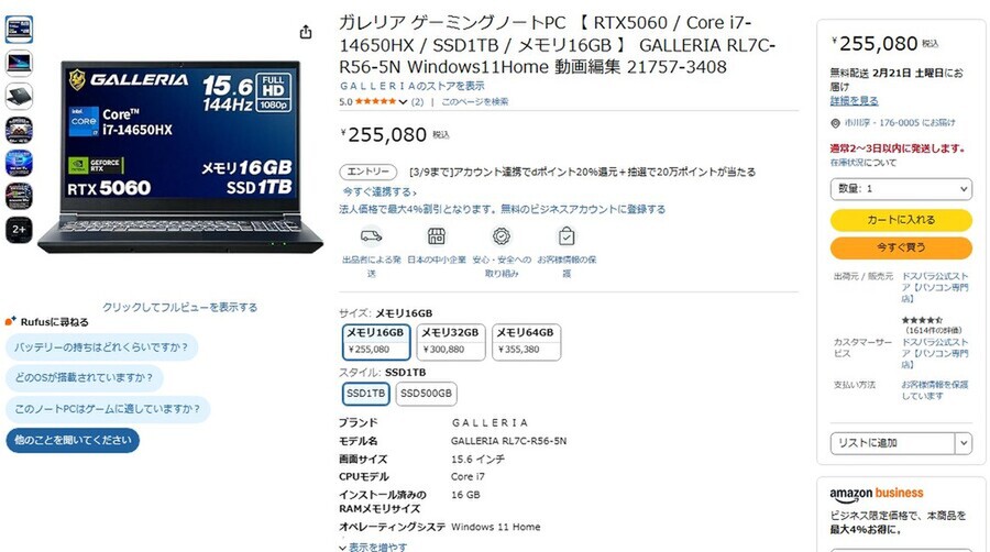 Amazon.co.jpにて、GALLERIAの15.6型ゲーミングノートPC「GALLERIA RL7C-R56-5N」が販売中だ。メモリー16GBモデルの価格は25万5080円。