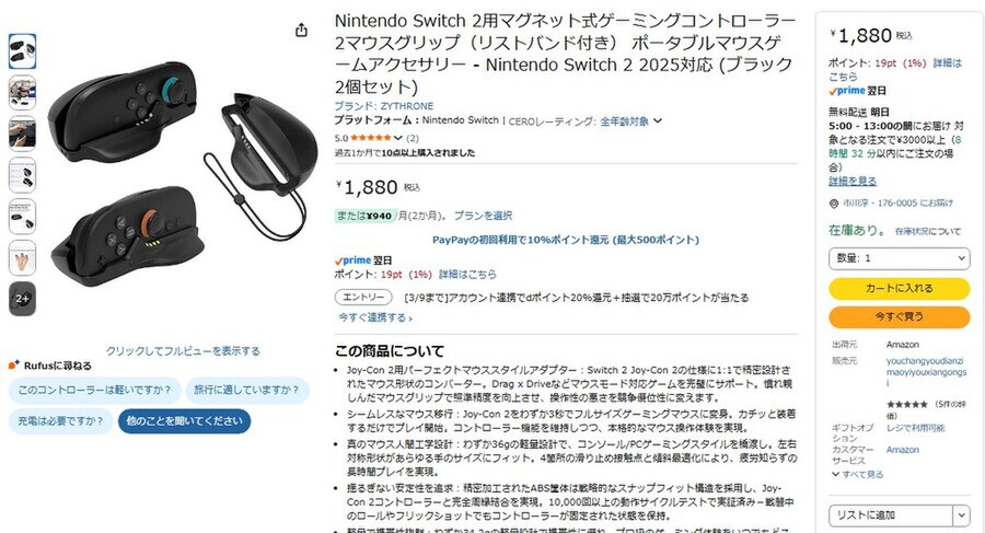 Amazon.co.jpにて、「Nintendo Switch 2用マグネット式ゲーミングコントローラー 2マウスグリップ(リストバンド付き)」が販売中だ。価格は1880円。