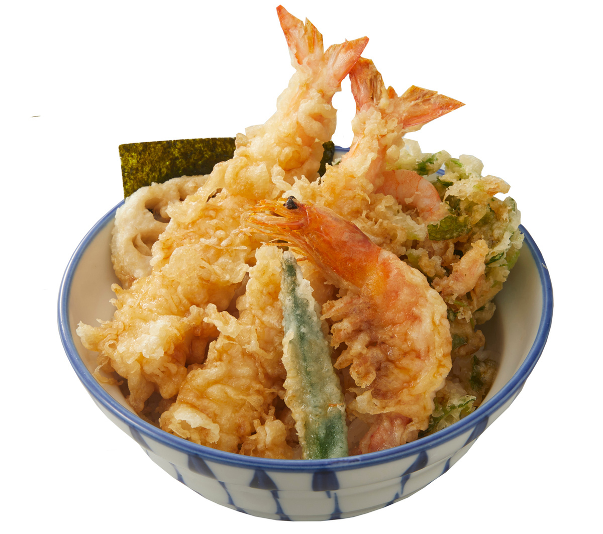海老天2尾に加え、頭まで食べられる有頭海老と小海老のかき揚げを盛り合わせた、3種類の海老を味わえる天丼です。レンコン、オクラ、のりも添えられています。