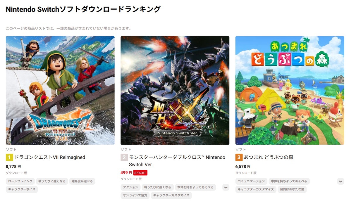 Nintendo Switch用ソフトのダウンロードランキングにて、カプコンの「モンスターハンターダブルクロス Nintendo Switch Ver.」(2017年発売)が499円(87%オフ)セールを実施し、2位へ急浮上したと話題となっている。