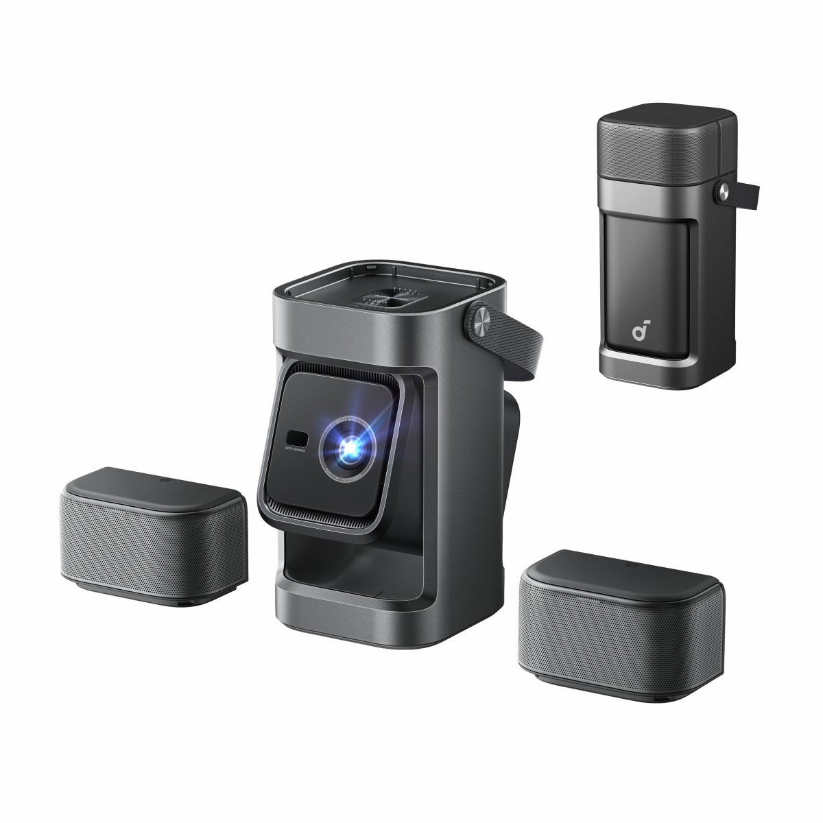 スピーカーはプロジェクター本体に戻すだけで充電でき、約3時間の充電で最大20時間の再生が可能。独自の画像補正エンジン「NebulaMaster」やフレーム補間技術「MEMC」を搭載し、垂直方向に130°の確度調節ができる内蔵ジンバルで天井投影も可能だ。