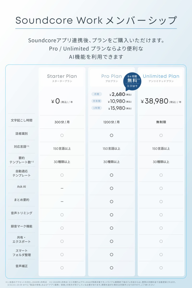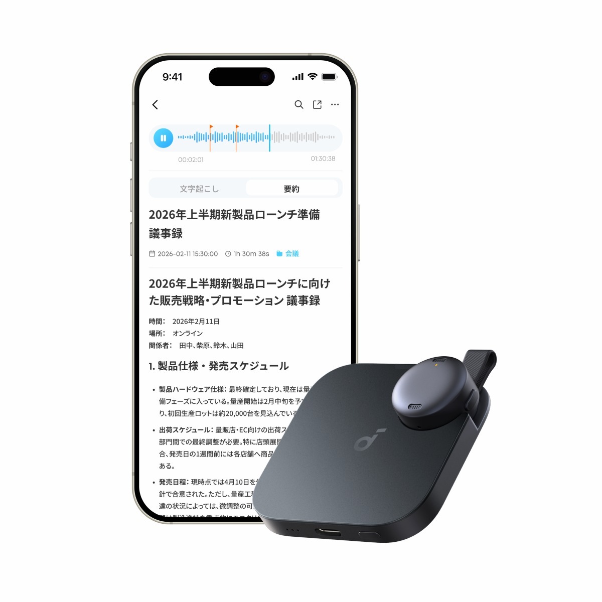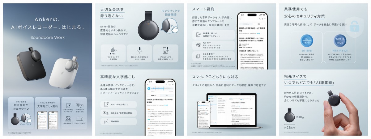 アンカー・ジャパンは2月18日、同社初のウェアラブルAIボイスレコーダー「Soundcore Work」の予約販売を開始した。世界150以上の言語を文字起こしでき、マイクは襟元や首元に違和感なく装着できる。3月3日販売開始で、通常価格は2万4990円。3月2日23時59分までの初回セールではAmazonで30%ポイント還元、公式オンラインストアでは30%オフ。