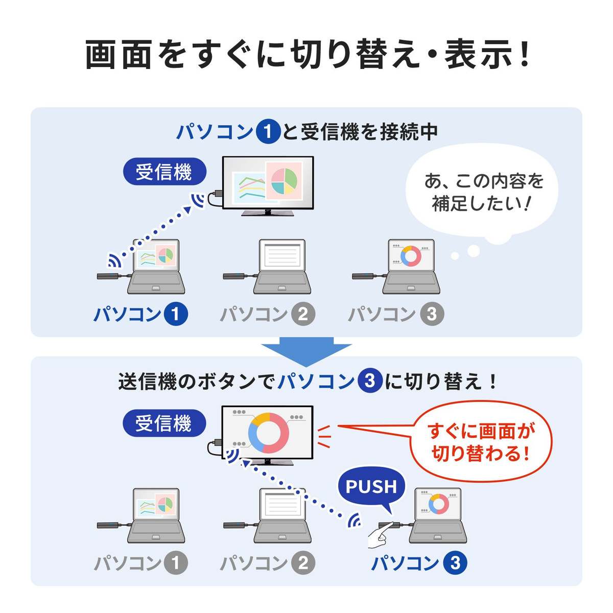 新製品の最大の特徴は、送信機と受信機がペアリング済みで、接続するだけで簡単にワイヤレス化できる点だ。特に会議など、複数名の映像を切り替えて表示したいシーンで有効だという。送信機×2台と受信機×1台のセットにより、2つの異なるパソコンを素早く切り替えられる。