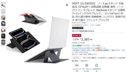 MOFTの非粘着ノートPCスタンドが、Amazonでタイムセール対象。過去価格3,980円のところ、15%オフの3,383円で販売中。