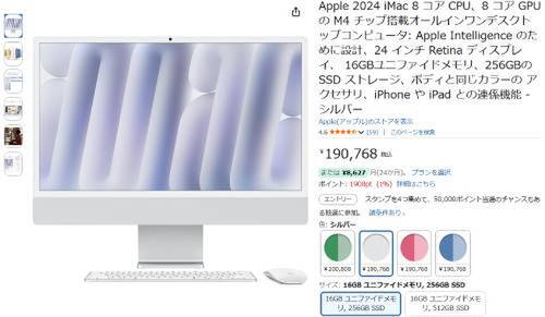 Apple「24インチiMac(M4/16GBユニファイドメモリ/256GB SSD)」が、Amazonで190,768円で販売中。
