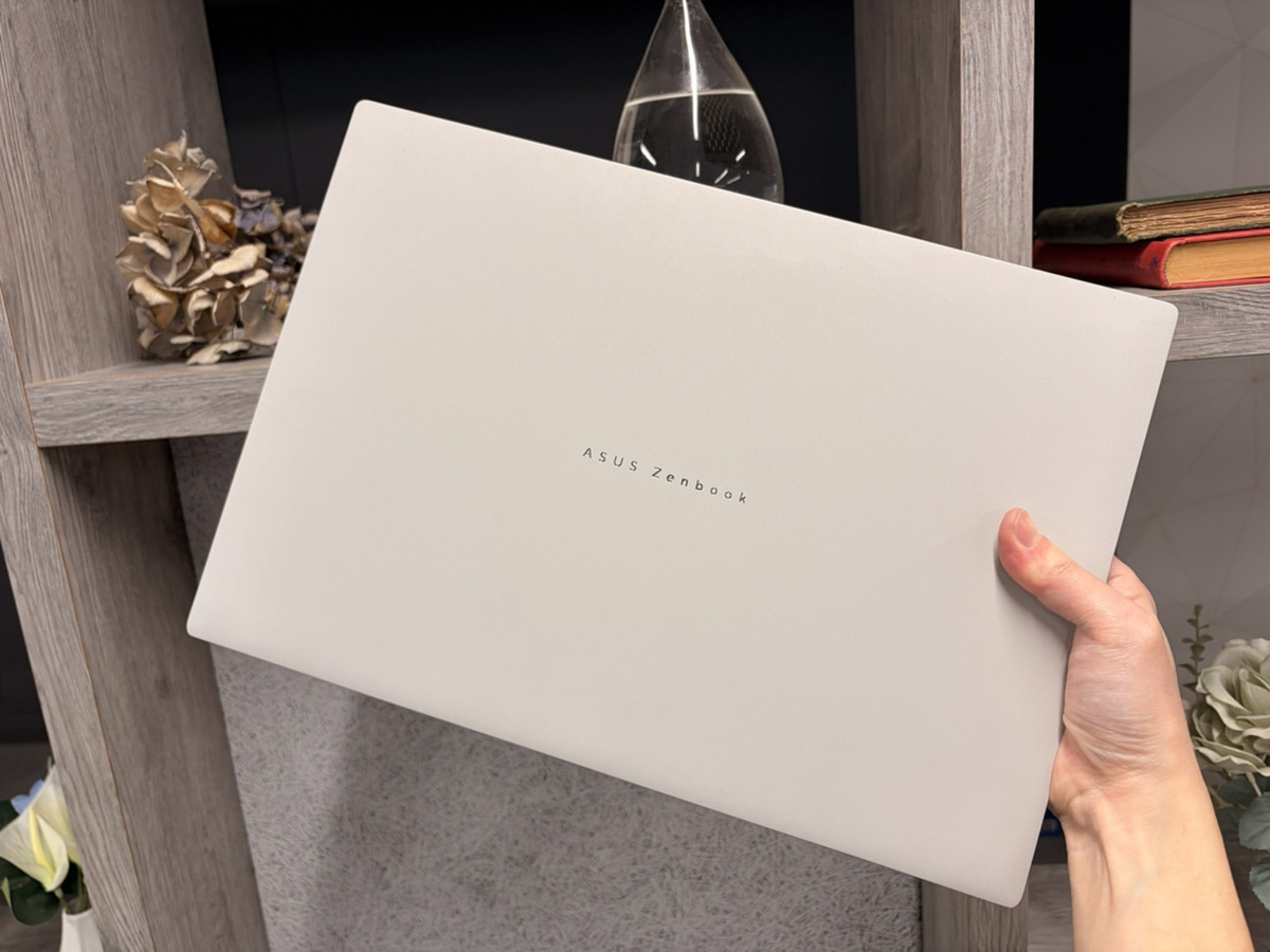 Zenbook S16の最大のポイントは、手にした瞬間の「軽さ」です。16インチという広いディスプレーを備えながら、重量は約1.5kg、最薄部は11.9mmという驚異的なスリムボディを実現しています。