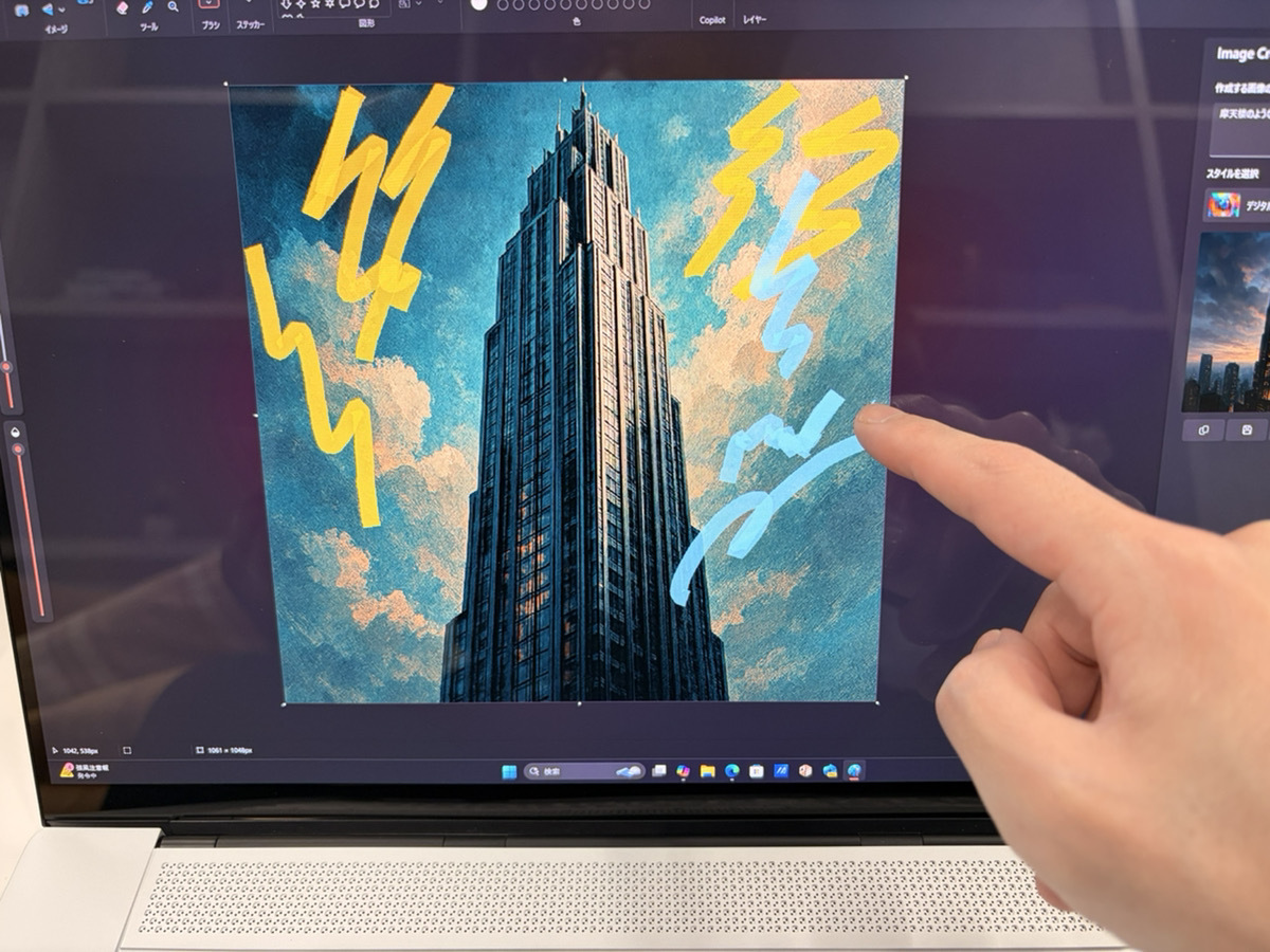 さらに、この美しい画面が「タッチ対応」である点も見逃せません。Windows 11のAI機能を活用する際、直感的に画面に触れて操作できるのは大きなアドバンテージ。AIによる画像生成の指示を出したり、スライドのレイアウトを微調整したりする際、マウスやトラックパッドだけでなく「指」を併用することで、作業効率が劇的に向上しますよ。