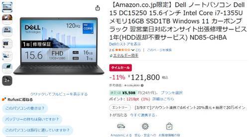 Dellの15.6型ノートPC「Dell 15 DC15250(ND85-GHBA)」がタイムセール対象。参考価格136,800円のところ、11%オフの121,800円で販売中。