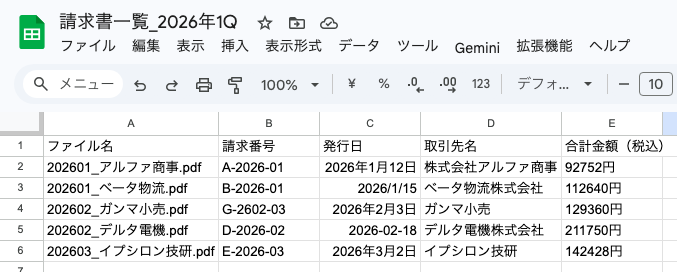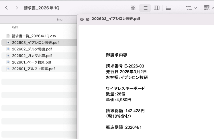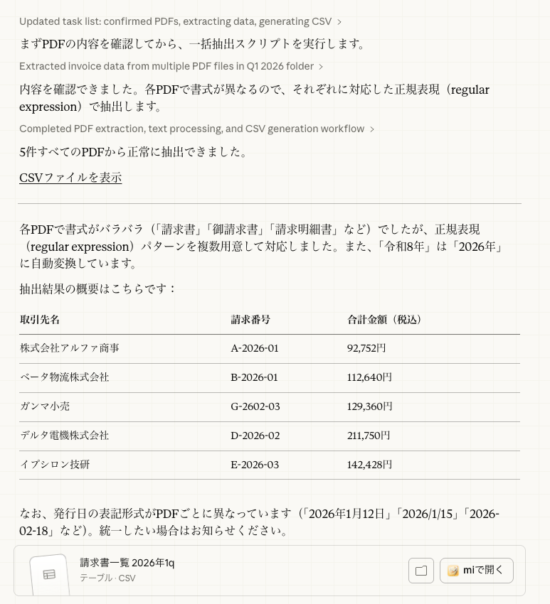フォルダーを指定し「このフォルダ内のすべての請求書PDFから、・請求番号・発行日・取引先名・合計金額(税込)を抽出し、一覧のCSVファイルを作成して保存して」と指示。