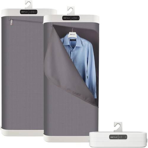 ハンガーに掛けたまま使う構造。アイロン台を出す必要はない。帰宅後のコートやスーツをそのままセットできる。折りたたみ式で、使わないときはコンパクトに収納できる。