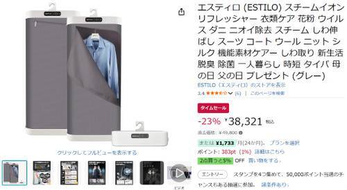 ESTILOの「スチームイオンリフレッシャー」が、Amazonでタイムセール対象。過去価格49,800円のところ、23%オフの38,321円で販売中。