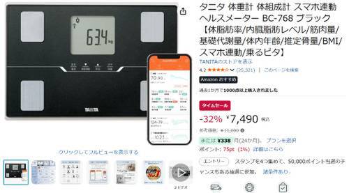 TANITA(タニタ)の体組成計「BC-768」が、Amazonでタイムセール対象。参考価格11,000円のところ、32%オフの7,490円で販売中。