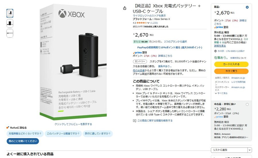 Amazon.co.jpにて、マイクロソフトの「Xbox 充電式バッテリー+USB Type-Cケーブル」が販売中だ。価格は2670円。