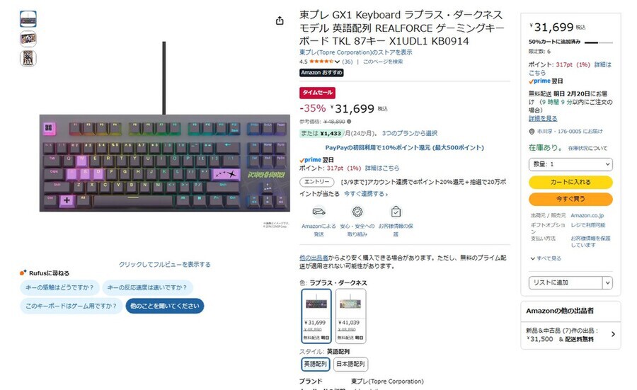 Amazon.co.jpにて、東プレのテンキーレスキーボード「REALFORCE GX1 Keyboard ラプラス・ダークネス モデル(英語配列)」が販売中だ。参考価格は4万8890円だが、タイムセールにより35%オフの3万1699円で購入できる(2月19日時点)。