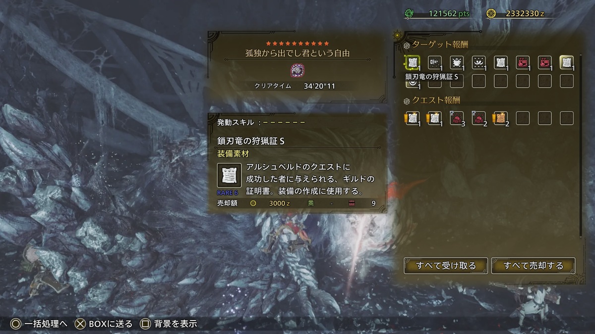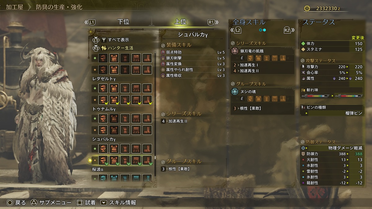 クリアすると「シュバルカγ」シリーズが生産可能に。スロット多めでグループスキル「ヌシの魂」も付いているので、非常に有用な防具だと感じた。